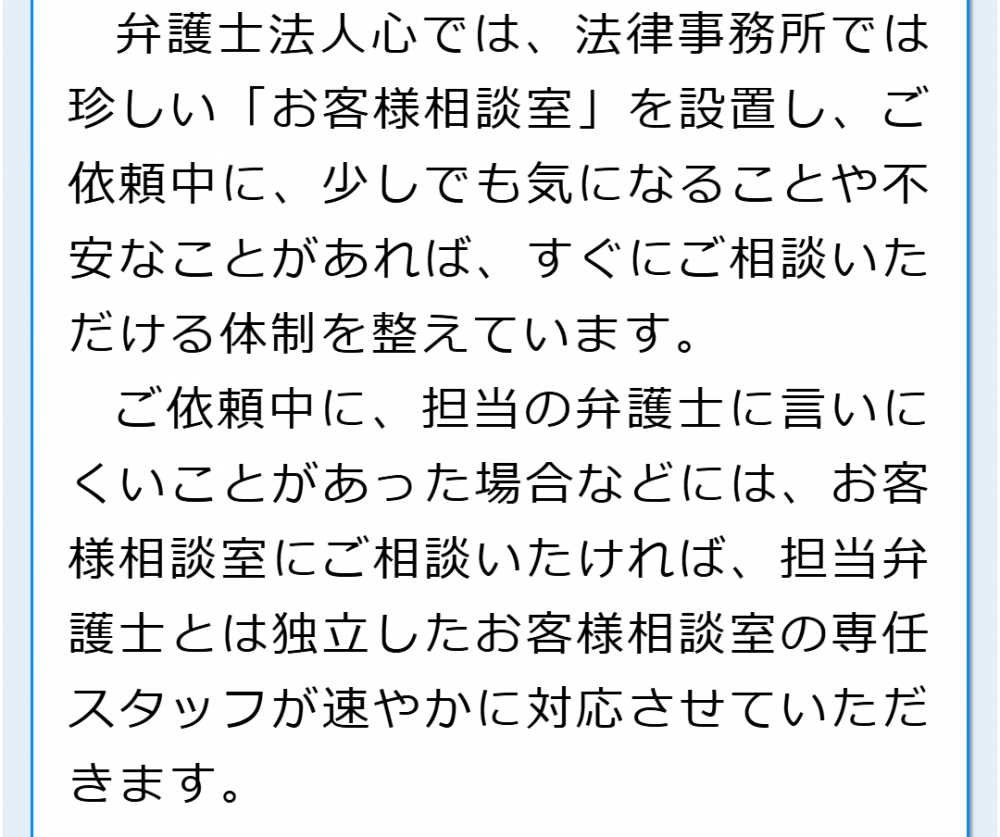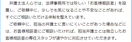 こちらでは当法人の強みや特徴をご紹介しています。借金の相談は原則無料ですし、お客様相談室を設置する等の取り組みも行っています。